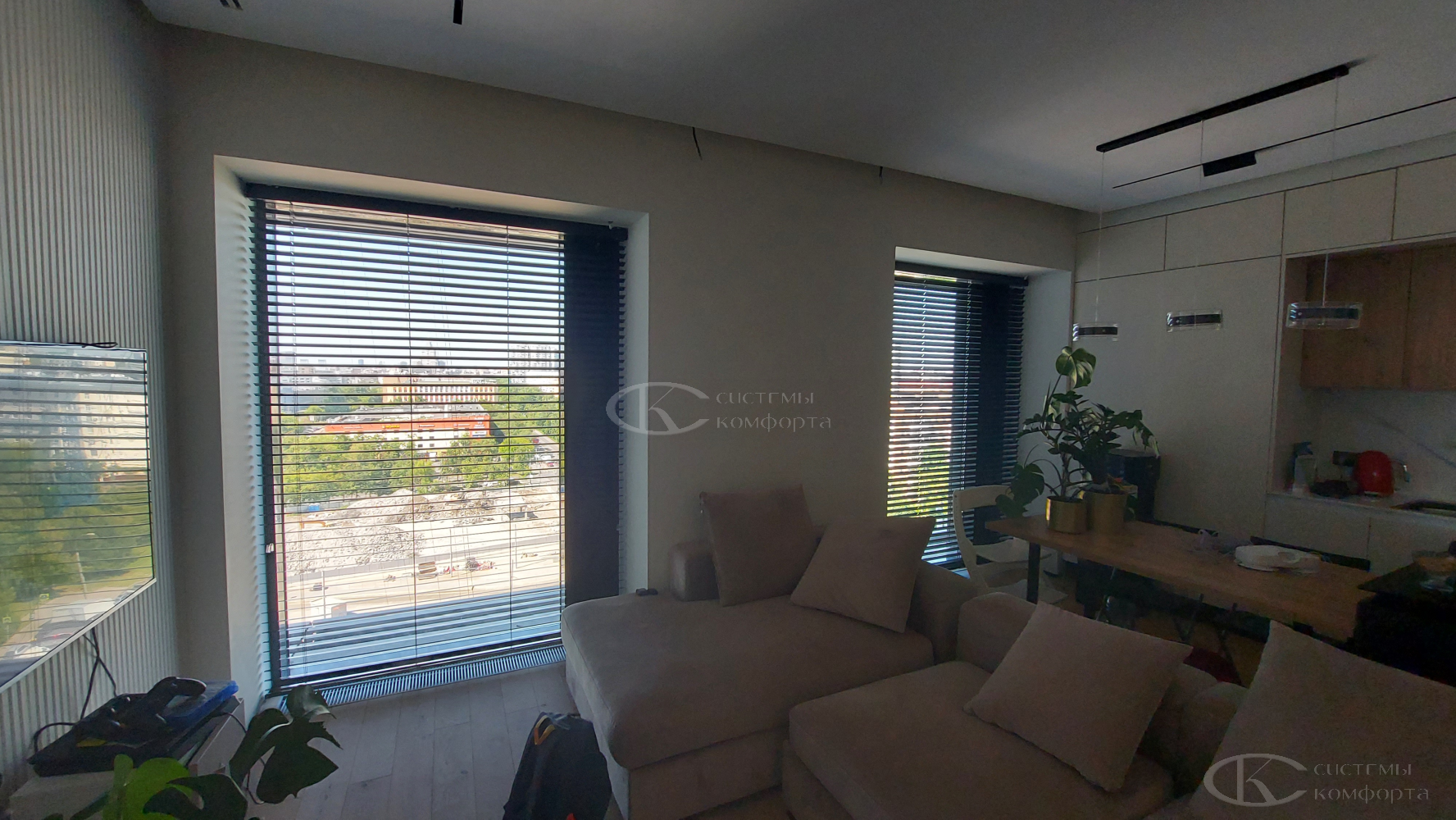 Жалюзи можно собрать полностью или оставить опущенными, но повернуть планки параллельно подоконнику — так свет будет беспрепятственно проникать в помещение.